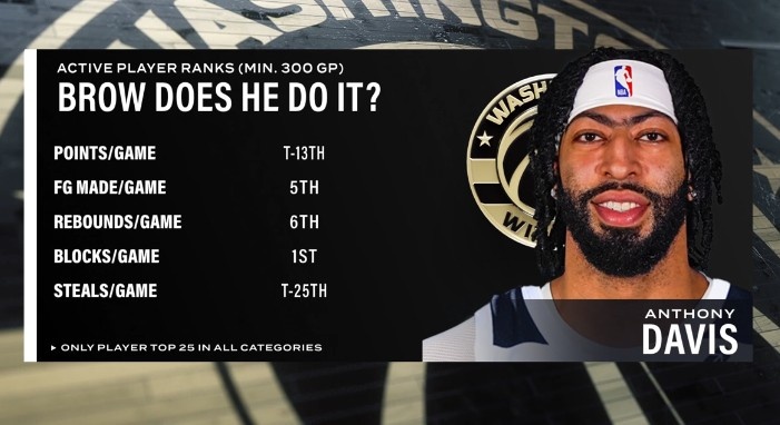 乐鱼vip-健康浓眉很能打!场均盖帽第1&场均篮板第6 浓眉多项数据现役前列